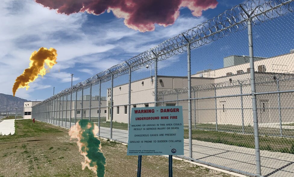 -Pyro Parchman (Pennsylvania). Located in Centralia. In 1962, a coal seam running beneath this mining town caught fire—and it has been smoldering ever since. Once thriving, Centralia is now a ghost town. Detainees will help to map the town’s many sinkholes and carbon monoxide vents. They will be paid in Trump meme coins which can be redeemed at the facility store for safety equipment (such as hardhats, flashlights, or gloves). Filtration masks can only be redeemed with information on a friend or relative living illegally in the US.