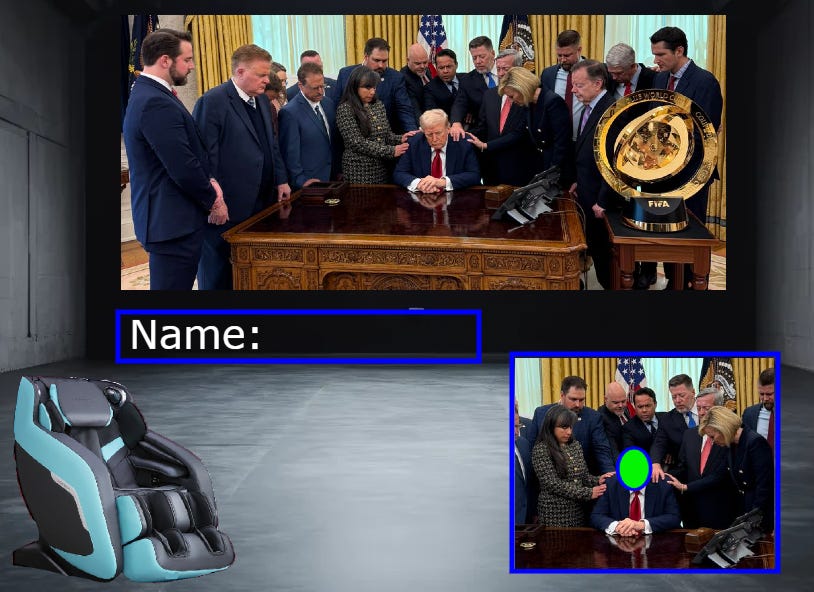 Get your shoulders massaged by faith leaders. Relax while prominent ministers from around the country exhort you to pursue your destiny. Green screen technology will project your face onto President Trump’s body. Enter your name to have the experience personalized! Speak in tongues to adjust the massage chair’s voice-activated settings.